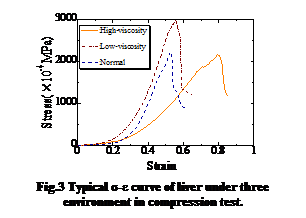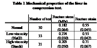 Fig.3に圧縮試験により得られた応力―ひずみ線図の一例を,Table 1に試験により得られた破壊応力,破壊ひずみの平均値と標準偏差を示す.液体を供給し肝小葉内部の水分含有量の均一化が行うと破壊応力は上昇した.また,流入させる液体の粘性を増加させた場合には,その破壊ひずみを著しく増加させ,従来のεf=0.5程度からさらに増大し,εf=0.71となった.これにより,肝臓はかなりの変形を加えられても圧縮途中において急激な応力低下を招かないために,従来考えられていた止血デバイスの圧迫量よりも大きくすることが可能である.このとき,以下の式を用いて勾配dσ/dεと応力σの関係は以下の式で表せる.