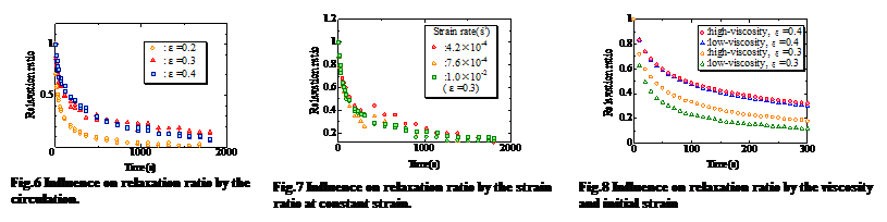 Fig.8に流入させる液体の粘度を変化させた際の初期ひずみごとの緩和率の時間的変化を示す.液体粘度の増大に伴い緩和傾向は緩やかになった.しかし,Fig.6,Fig.8 両者において初期ひずみε=0.4以上を与えたものにおいては緩和傾向の変化はほとんど認められなくなった.これはひずみの増大と共に,試験片内部にある類洞空洞が押しつぶされ,含有できる液体の総量が減ったためだと推察される.これらの結果は,肝臓は圧縮応力下における機械的特性は,内部に含有する液体の粘度および総量が大きく影響することを示している.