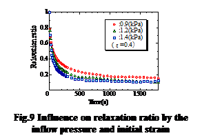 Fig.9に流入圧力による緩和傾向の変化を示す.流入圧力の上昇とともに応力の緩和傾向は急になった.応力の緩和は圧縮時に加えられたエネルギを緩和段階での内部含有液体の移動やそれに伴う変形で消費しているため,流入圧力の上昇に伴い肝臓内部における内部含有液体の移動・流出が促進されたためより応力を緩和し易くなったと推察される.