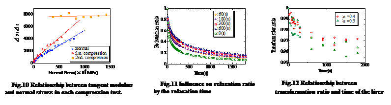 Fig.11に二次緩和段階における一次緩和時間ごとの緩和率を示す.二次圧縮段階では総じて一次圧縮段階よりも緩やかな緩和傾向となった.一次緩和段階の時間T1(s)を変化させたとき応力の緩和挙動はT1=0,0<T1<300,300≦T1,の三つに傾向に分類でき,T1>300sにおいて緩和率の上昇は頭打ちになり収束していった.