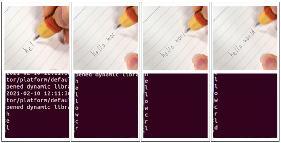 下図は、学習済みモデルをリアルタイムで動作させ、「hello world」を手書きしたときの認識結果を示しています。結果はほぼ文字を追従できた一方で、「o」が「c」と誤認識される場面もあり、リアルタイムで単語レベルまで安定して認識することが今後の目標であることを示唆しています。